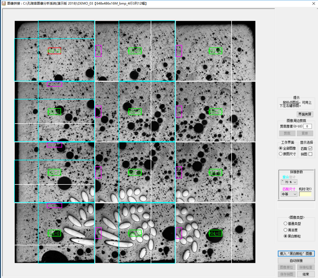 l 圖像拚接功能:對於需要檢測更大視(shì)場要求的客戶,軟件中提供了(le)圖像拚(pīn)接功能,用戶(hù)可以通過移動顯微(wēi)鏡X-Y平台方向(xiàng),來實現更(gèng)大視場圖像拍攝的需求,解決了顯微鏡視野範圍不足(zú)所造成的無法拍攝圖片的尷尬。設置好拚接參數和圖像類型,點(diǎn)擊自動拚接,自動完成圖像拚接