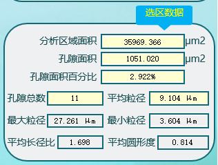 2、 孔隙分析:可分析出每個孔隙的周長、麵積、長軸(zhóu)、短(duǎn)軸、等效圓直徑、長徑比、圓形度等數據。