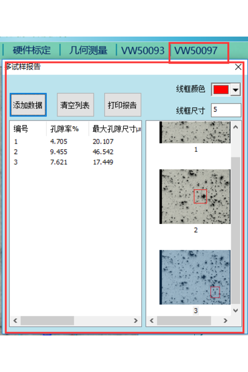 結果列表(biǎo):預置了10個部位列表位(wèi)置,每分析完一個選區的數據,就可加入(rù)到一個部位數據行,並(bìng)算出(chū)孔(kǒng)隙率、最大孔隙尺寸、測試麵積等參數。
